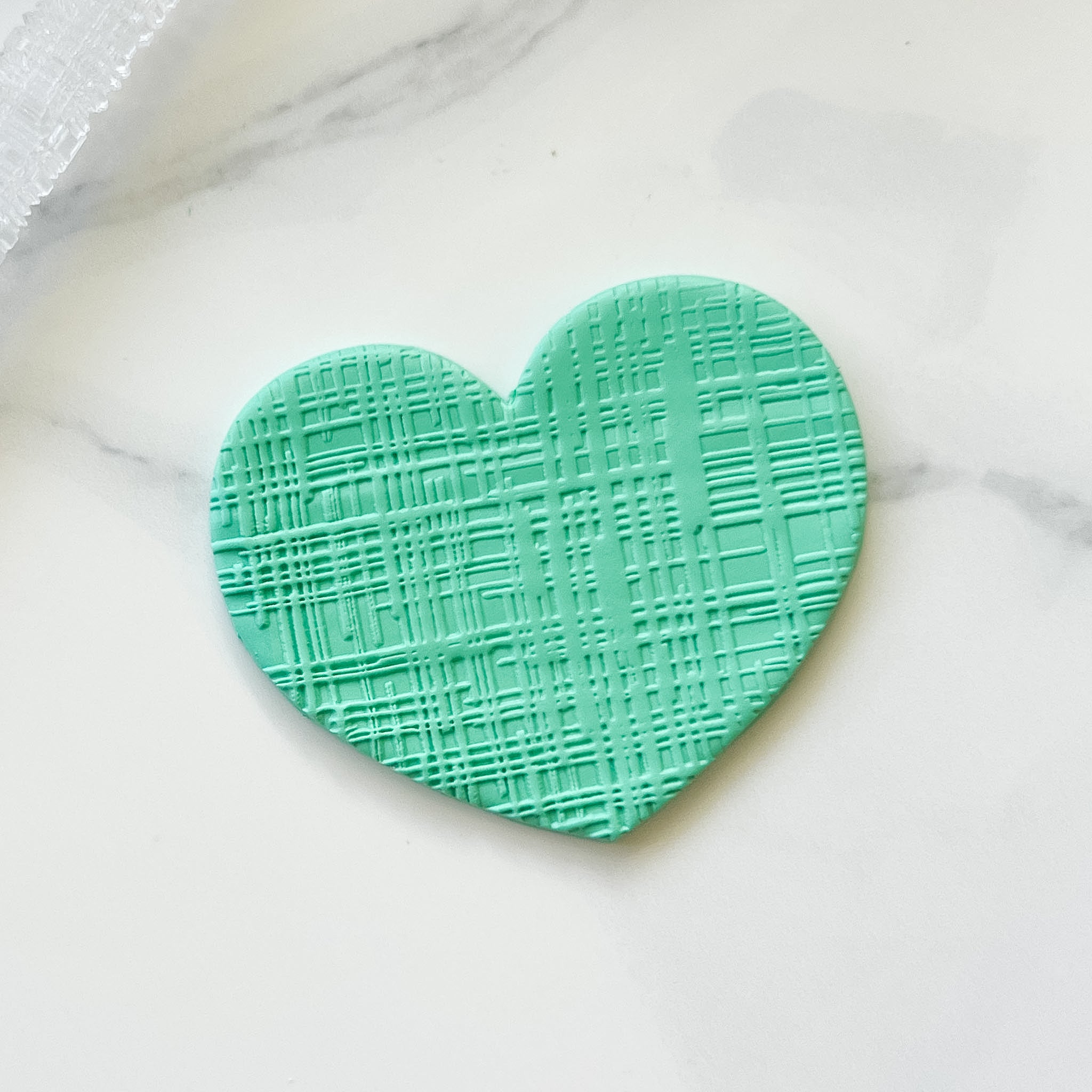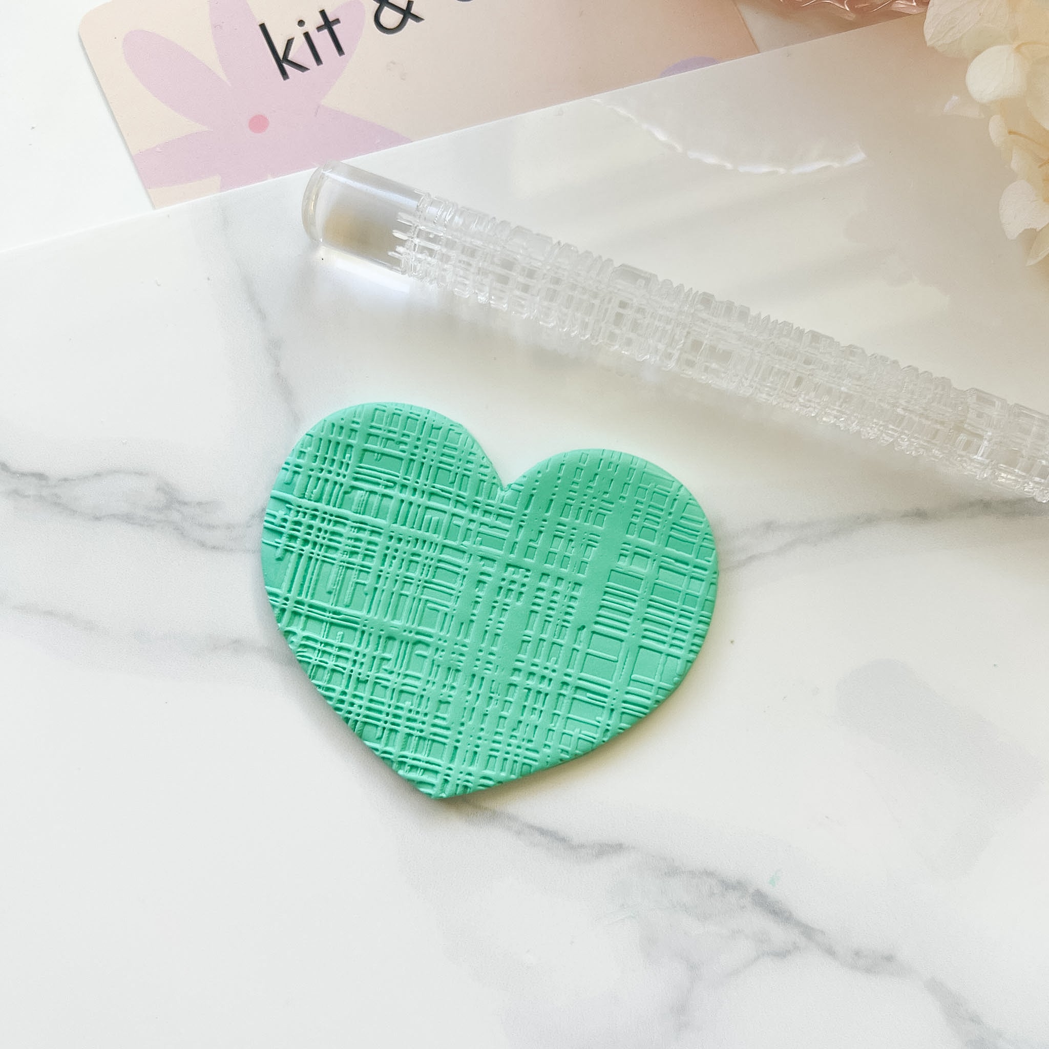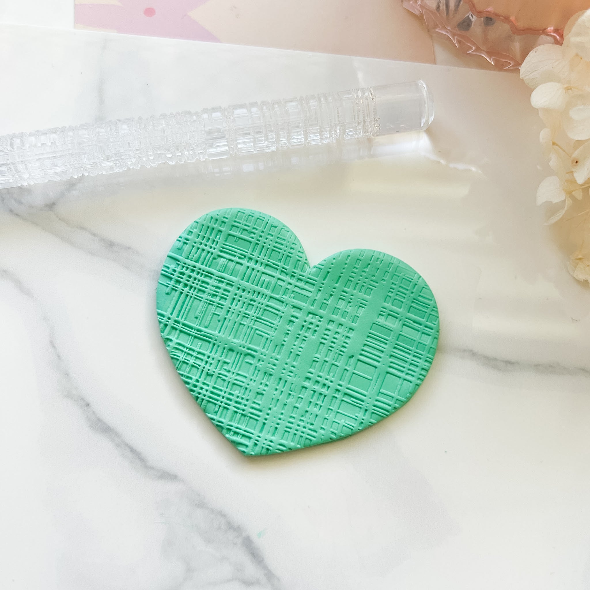 Engraved acrylic texture roller for use with fondant or polymer clay. Images show the effect of the roller on polymer clay.