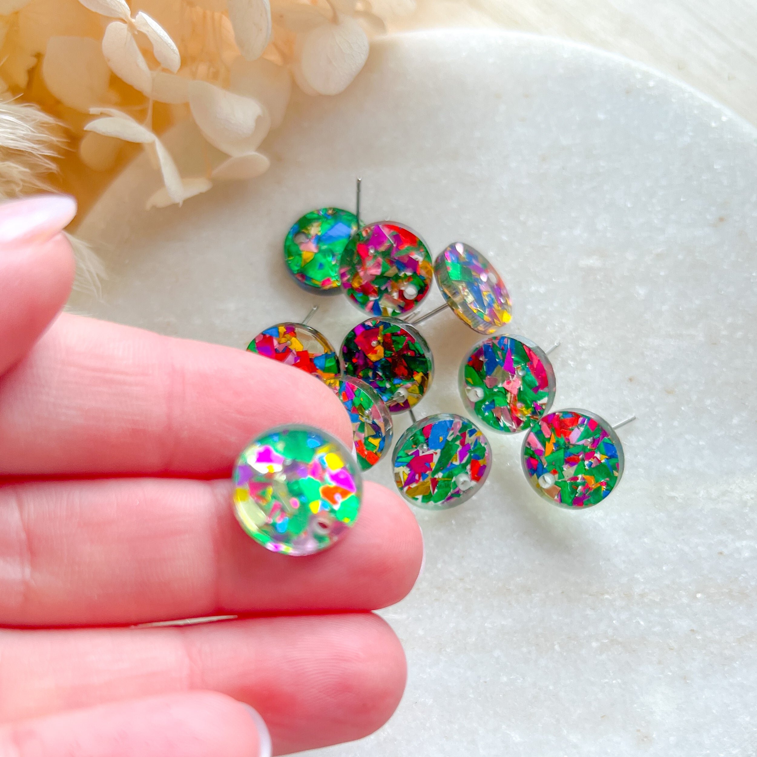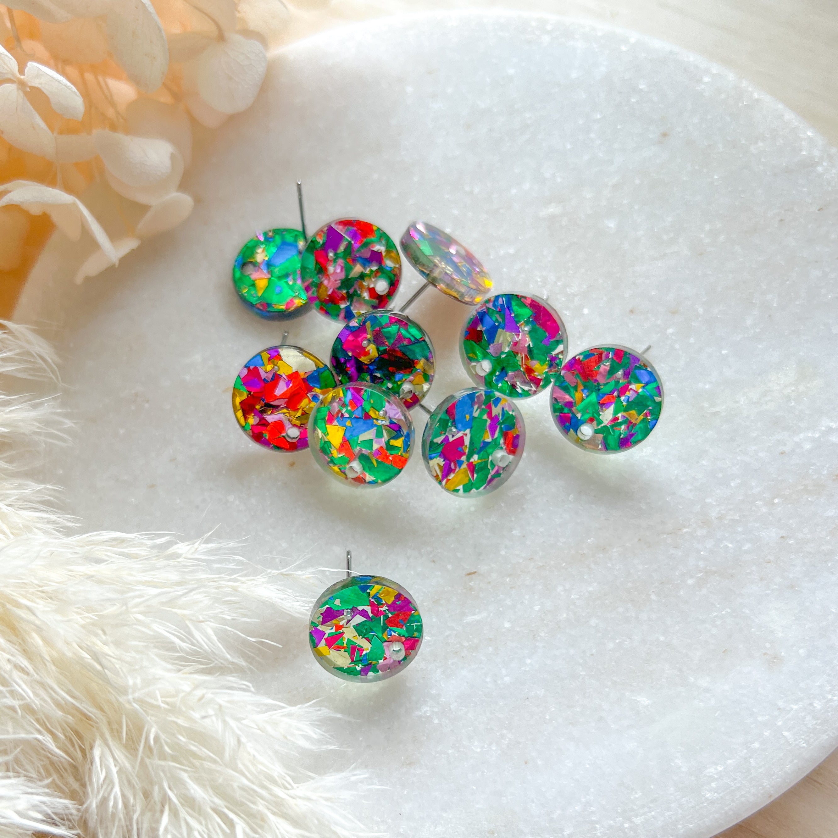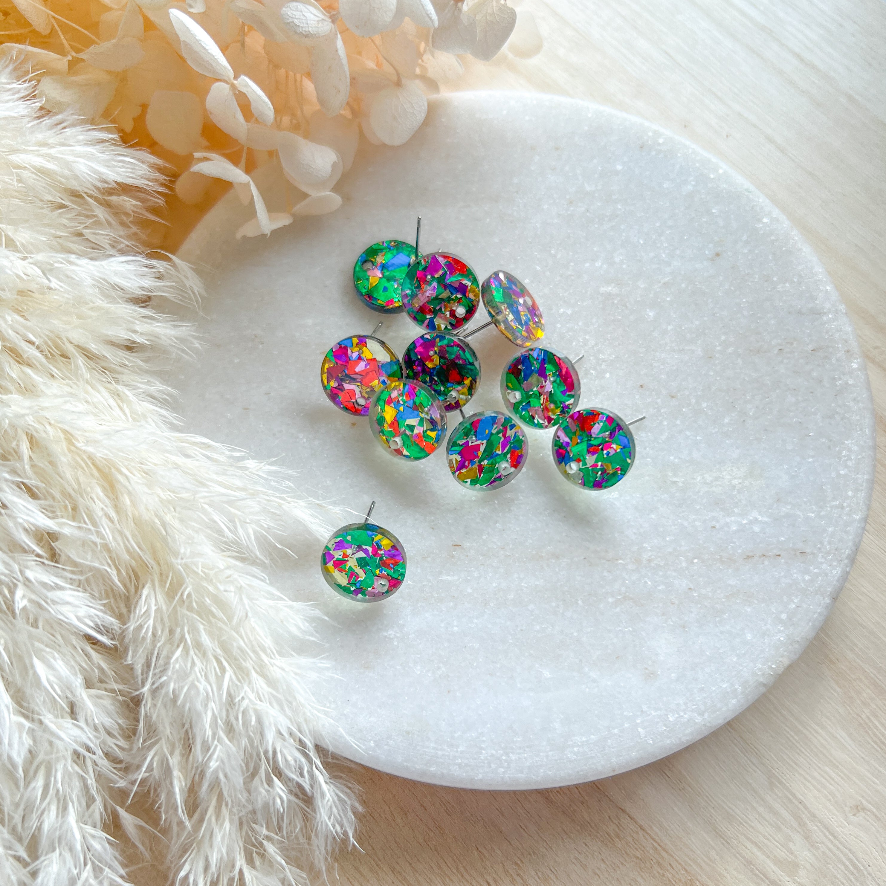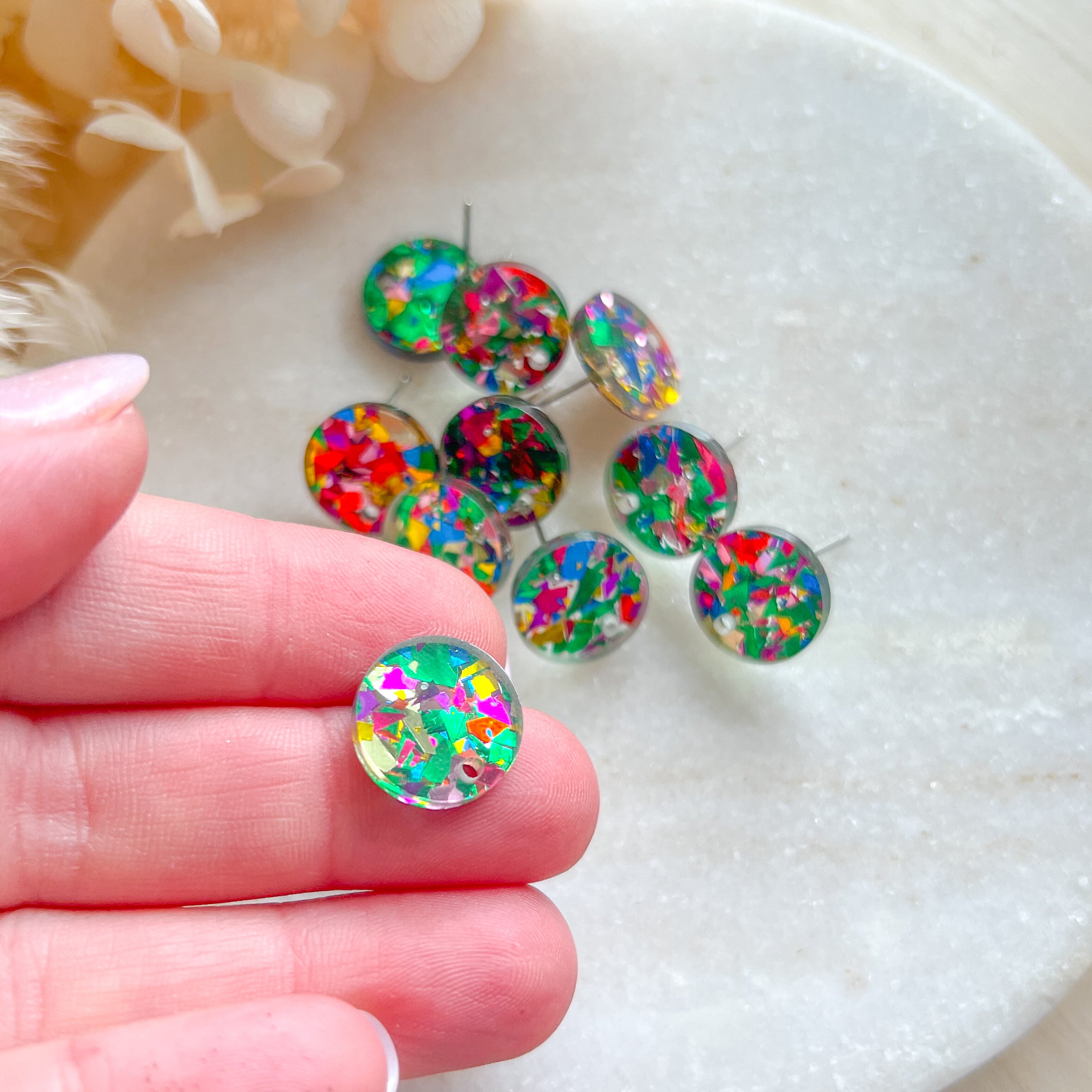 Acrylic earring post, mixed colour chunky glitter embedded, stainless steel prong, 10 pieces
