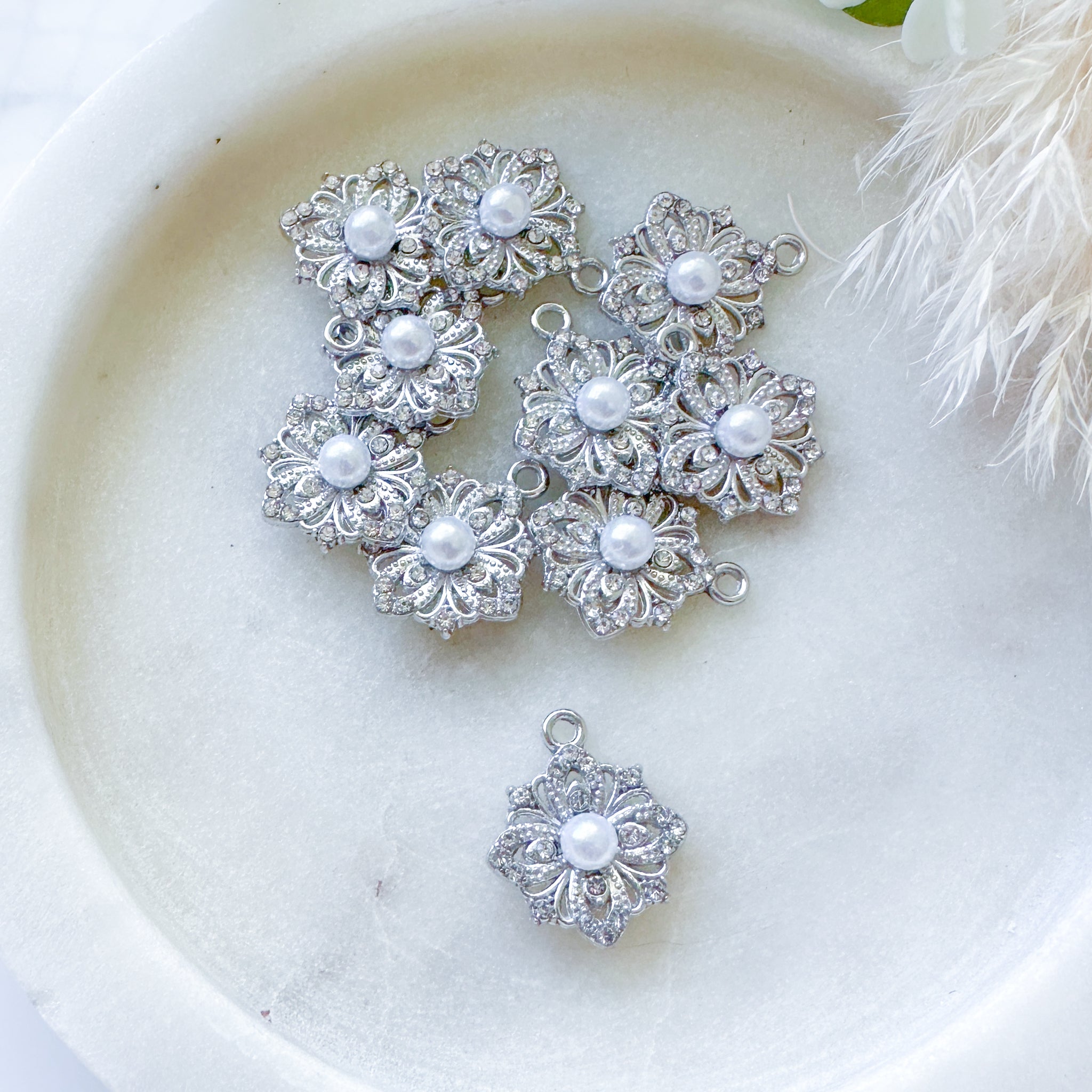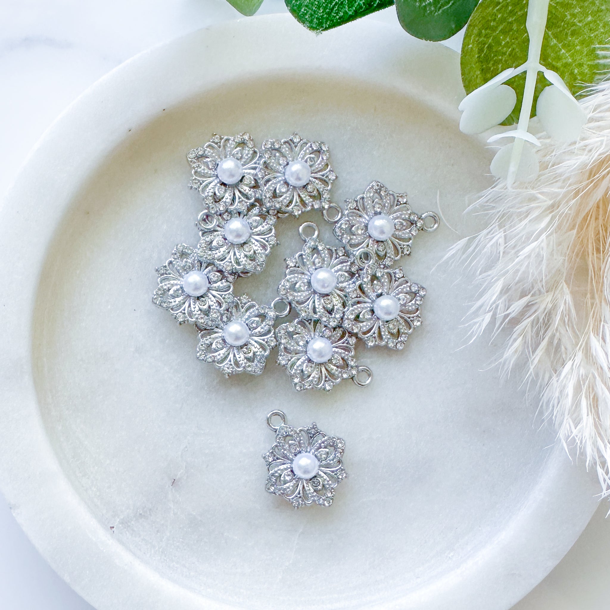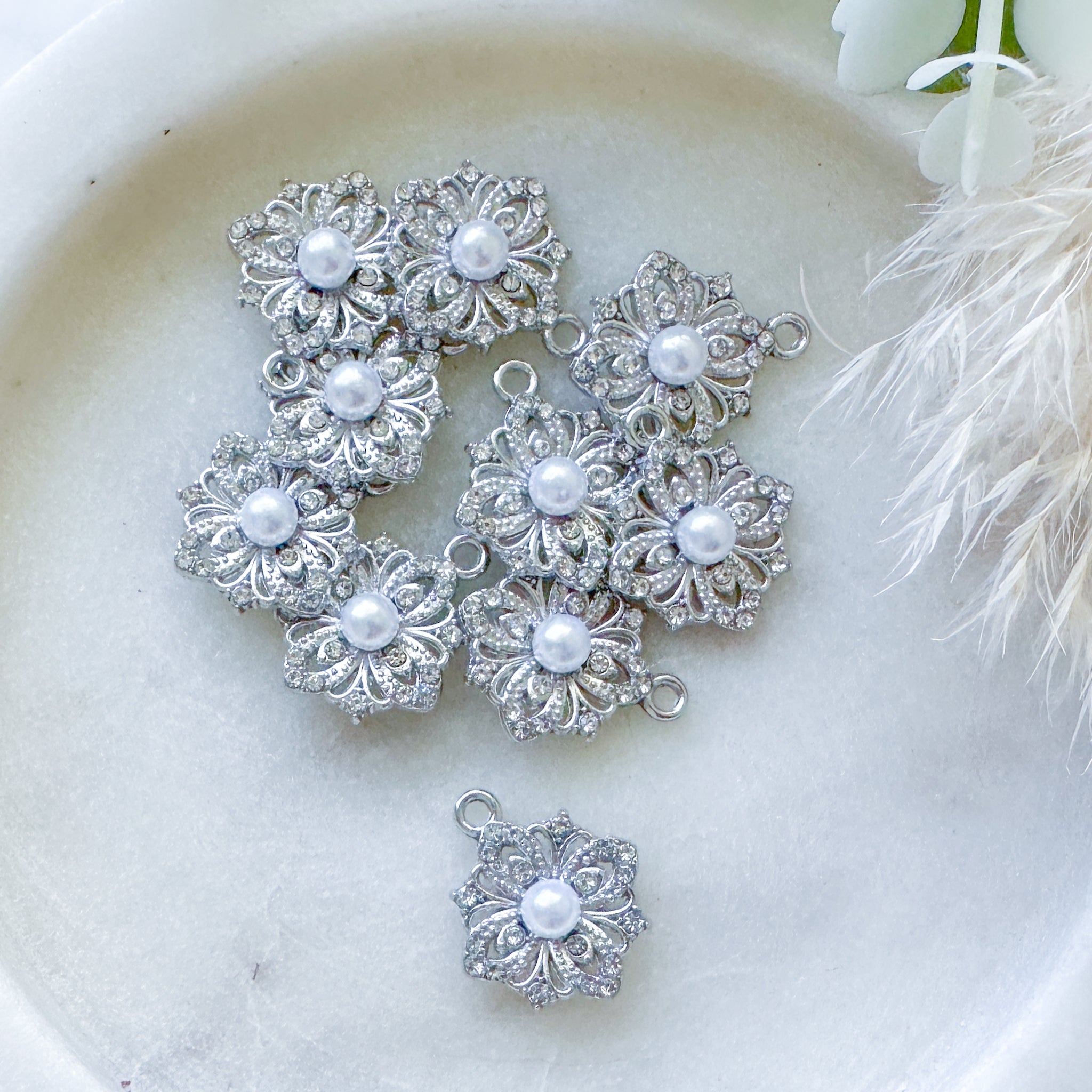 Rhodium plated, crystal inlaid with faux pearl centre, 10 pieces