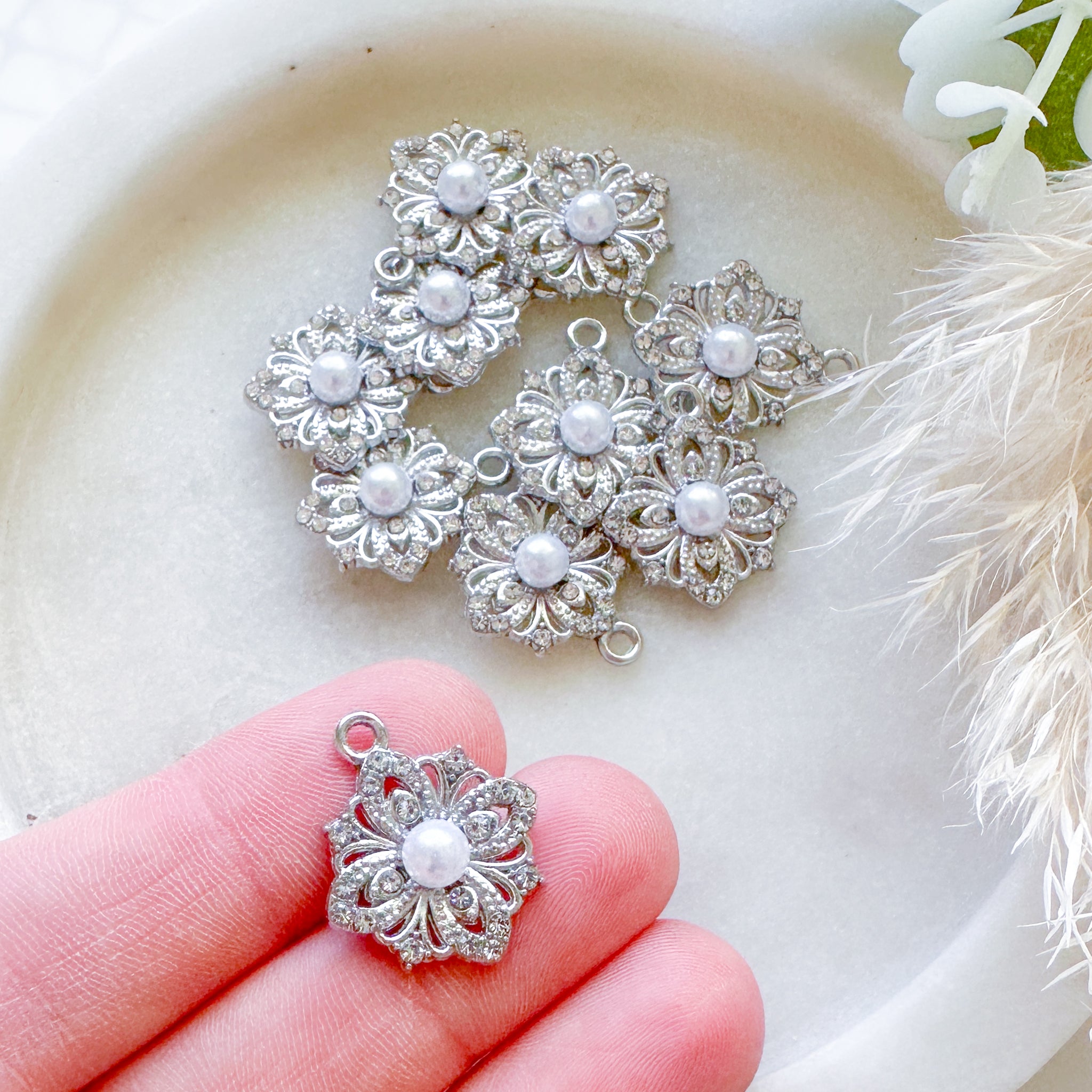 "Vintage" Pearl & Crystal Charm - 10 pcs Silver
